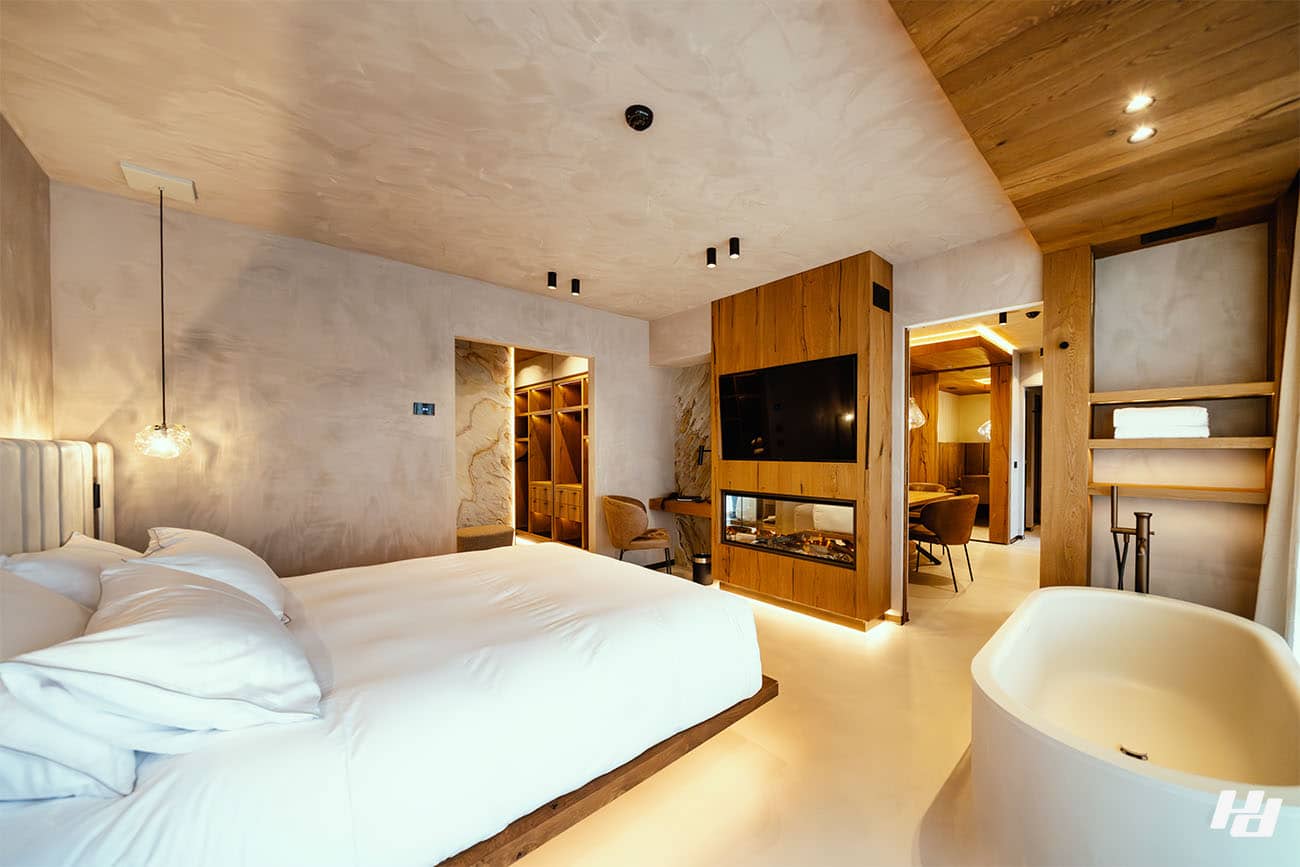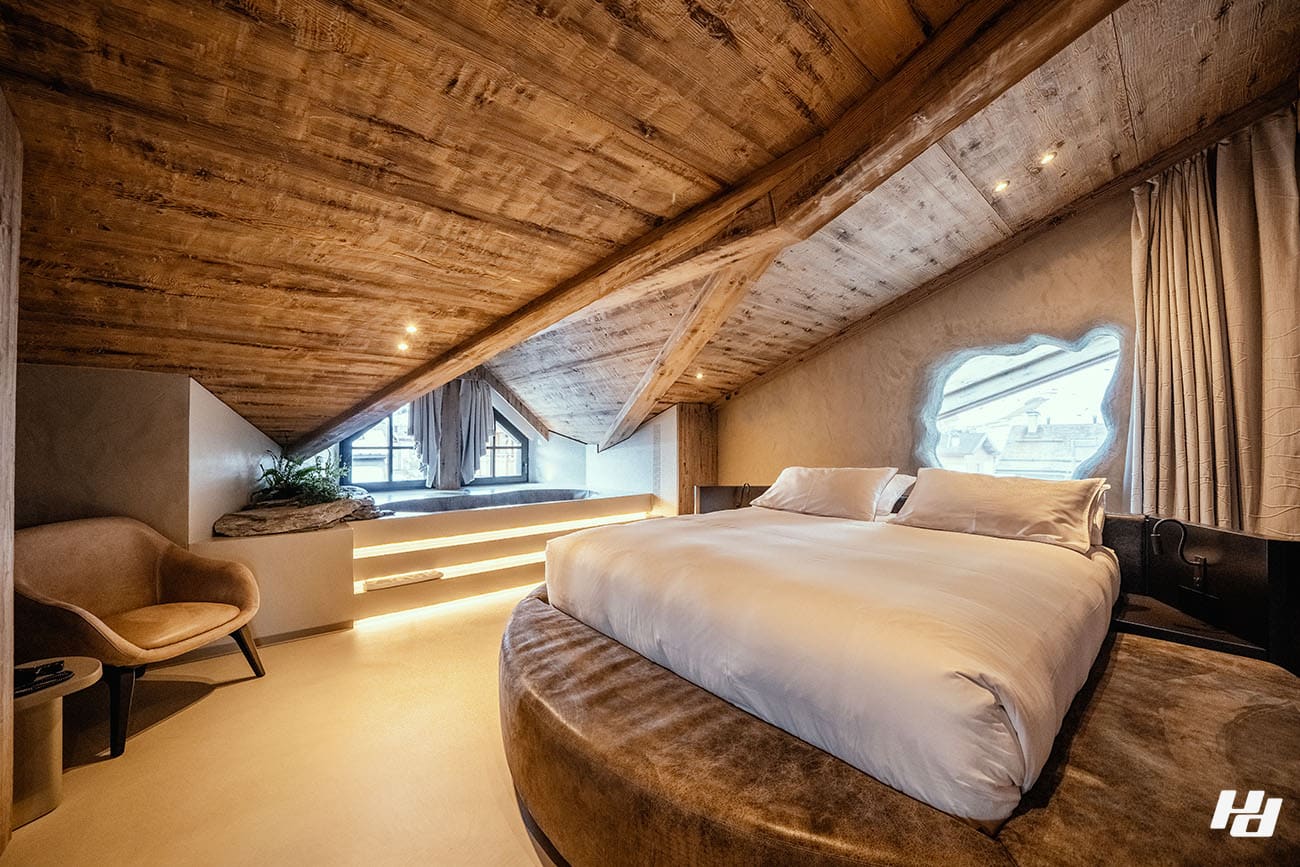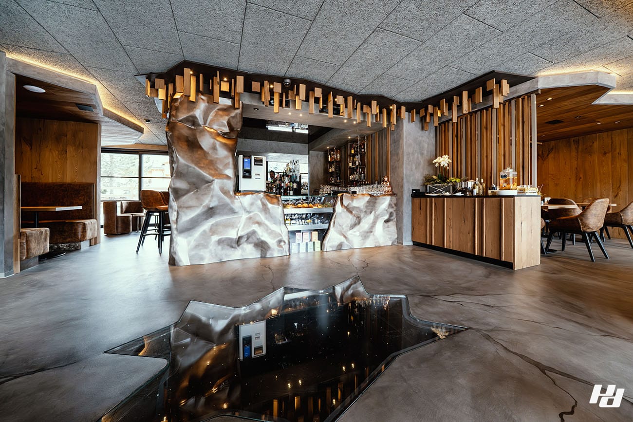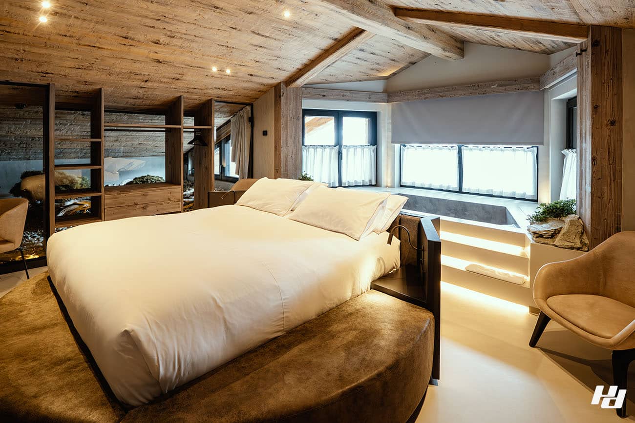 Ogni camera interpreta in modo unico lo splendore dell’Altopiano di Livigno, vestendosi di materiali naturali rigorosamente locali, come il legno e la pietra, e ospitando frammenti di natura fortemente voluti dalla proprietà: dalla vegetazione che richiama i boschi circostanti alla cascata di 17 metri che, dal laghetto collocato nella penthouse suite, scorre fino al pianterreno, per azionare le pale di un antico mulino tuttora utilizzato per macinare la farina con cui l’hotel prepara la propria pasta fresca.