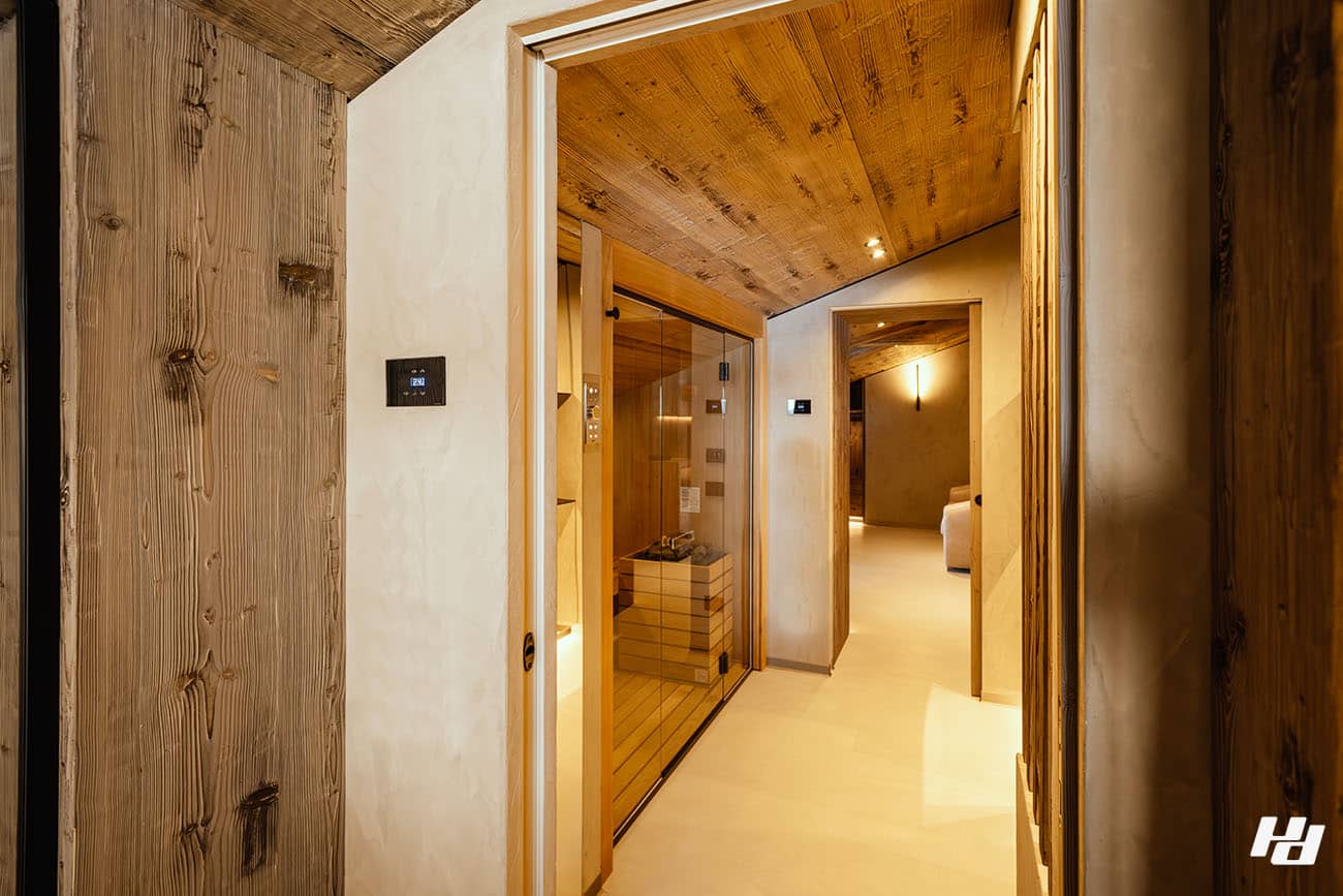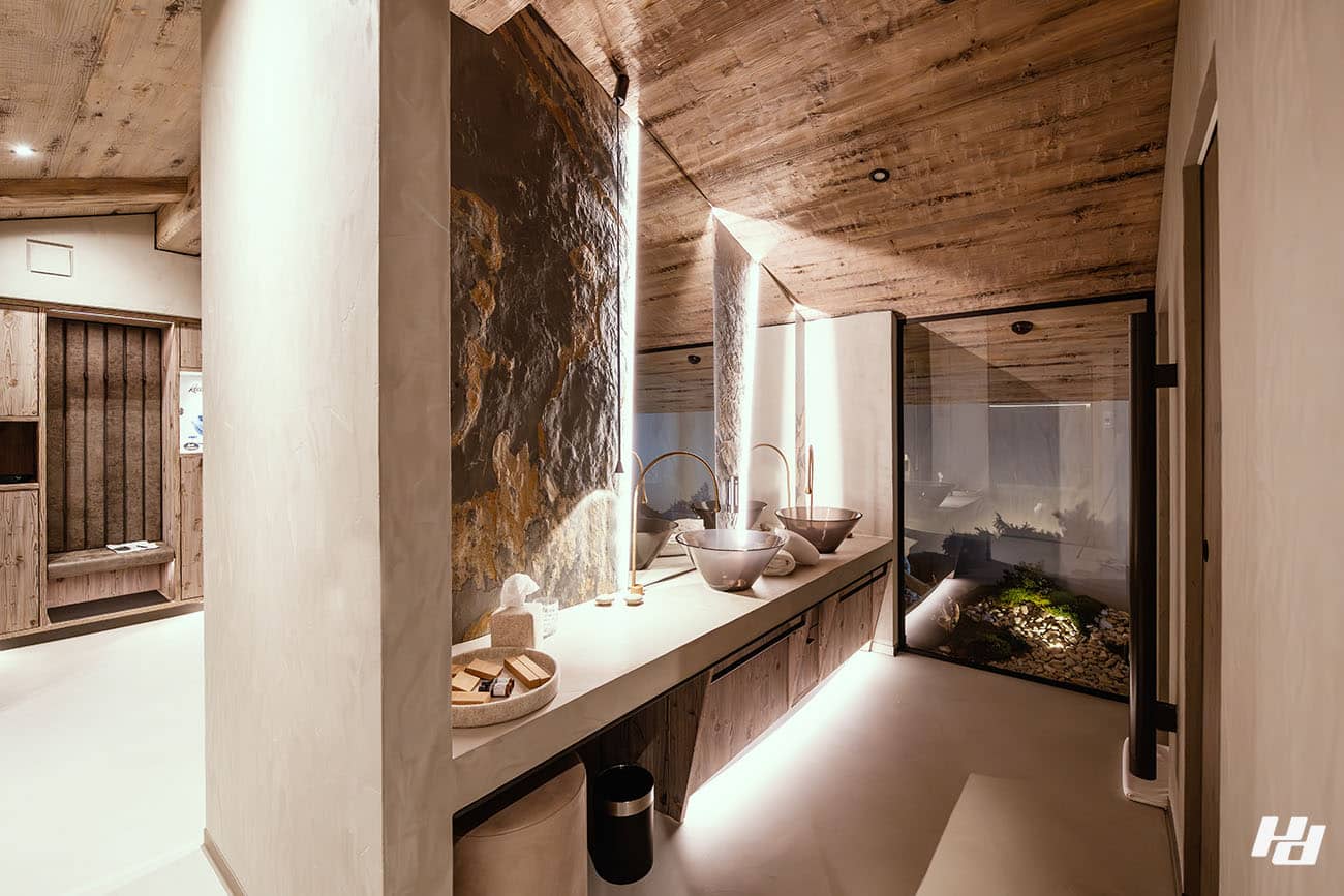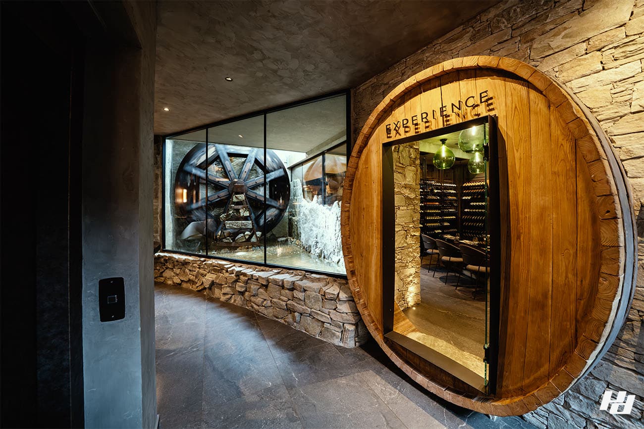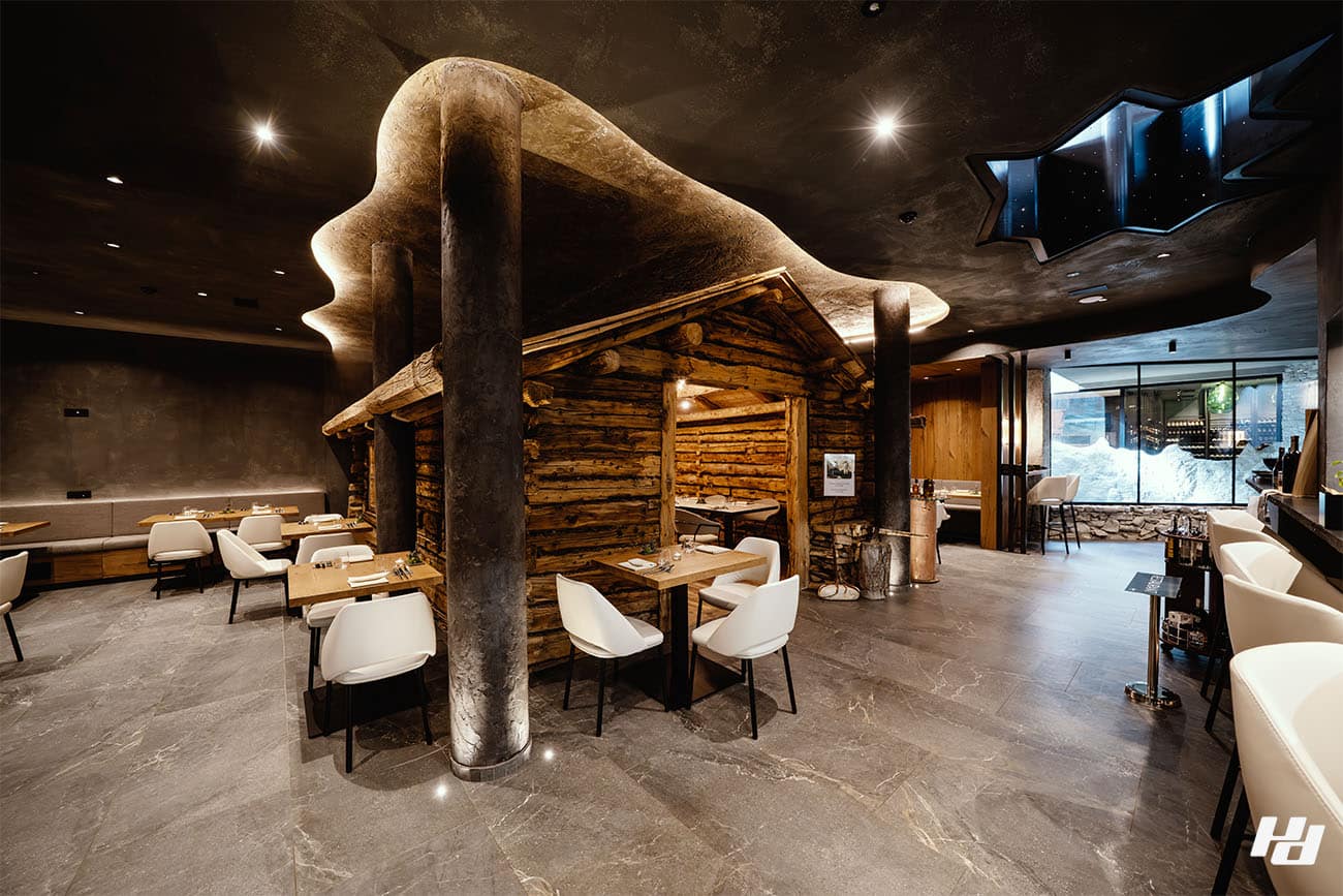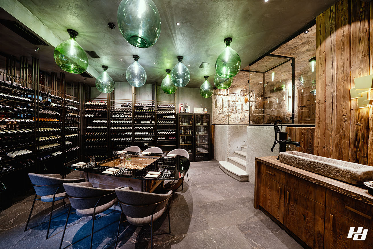 Completano la struttura una cantina con etichette accuratamente selezionate e un ristorante gourmet che ospita un’antica baita, interamente restaurata e riassemblata all’interno della struttura.