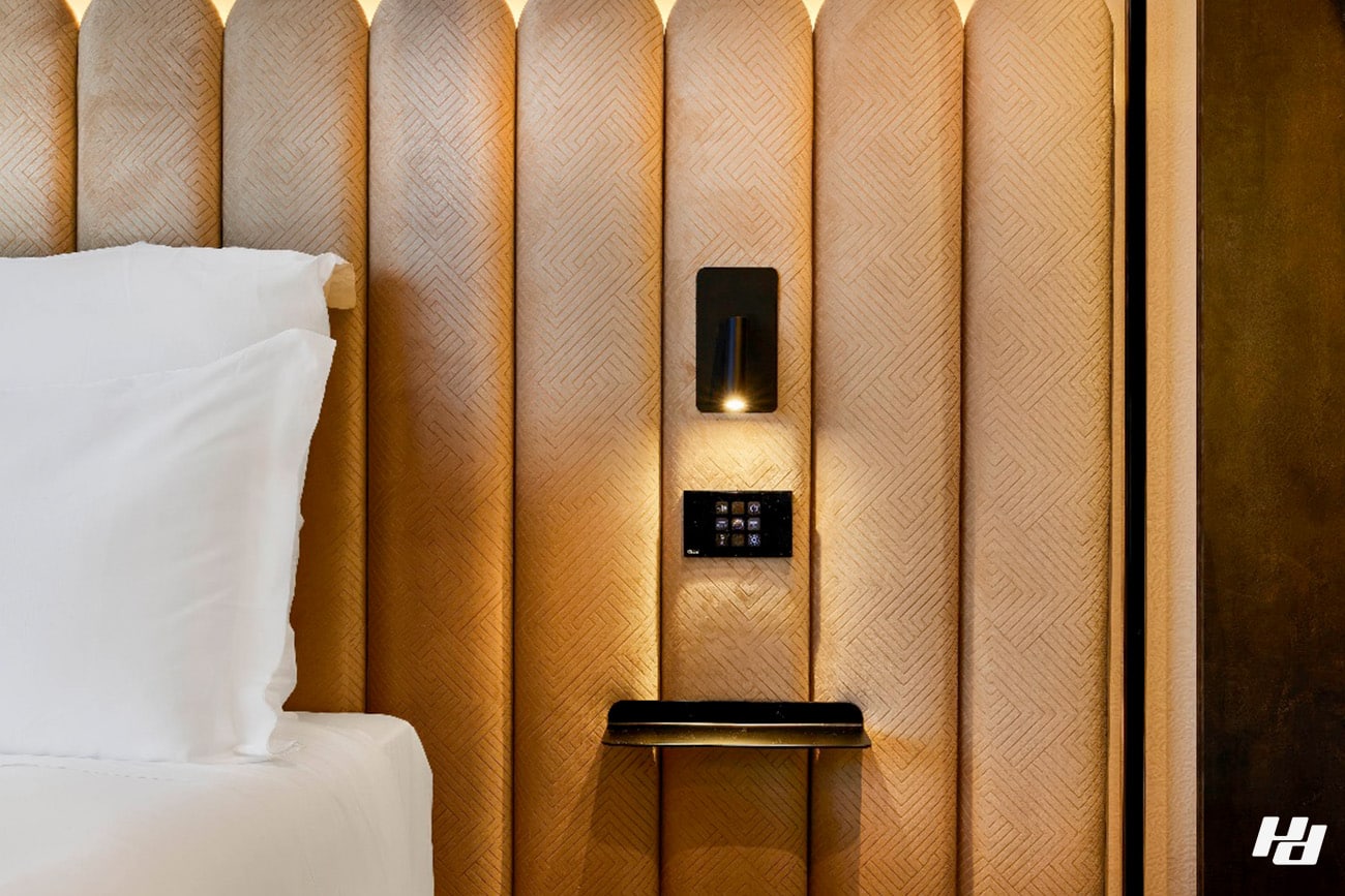Ogni stanza è dotata di sensori di presenza (PIR sensor) e sonde di temperatura ad alta precisione che consentono al sistema di calibrare illuminazione, riscaldamento e raffrescamento in base agli scenari di camera occupata, camera vuota e camera libera.
