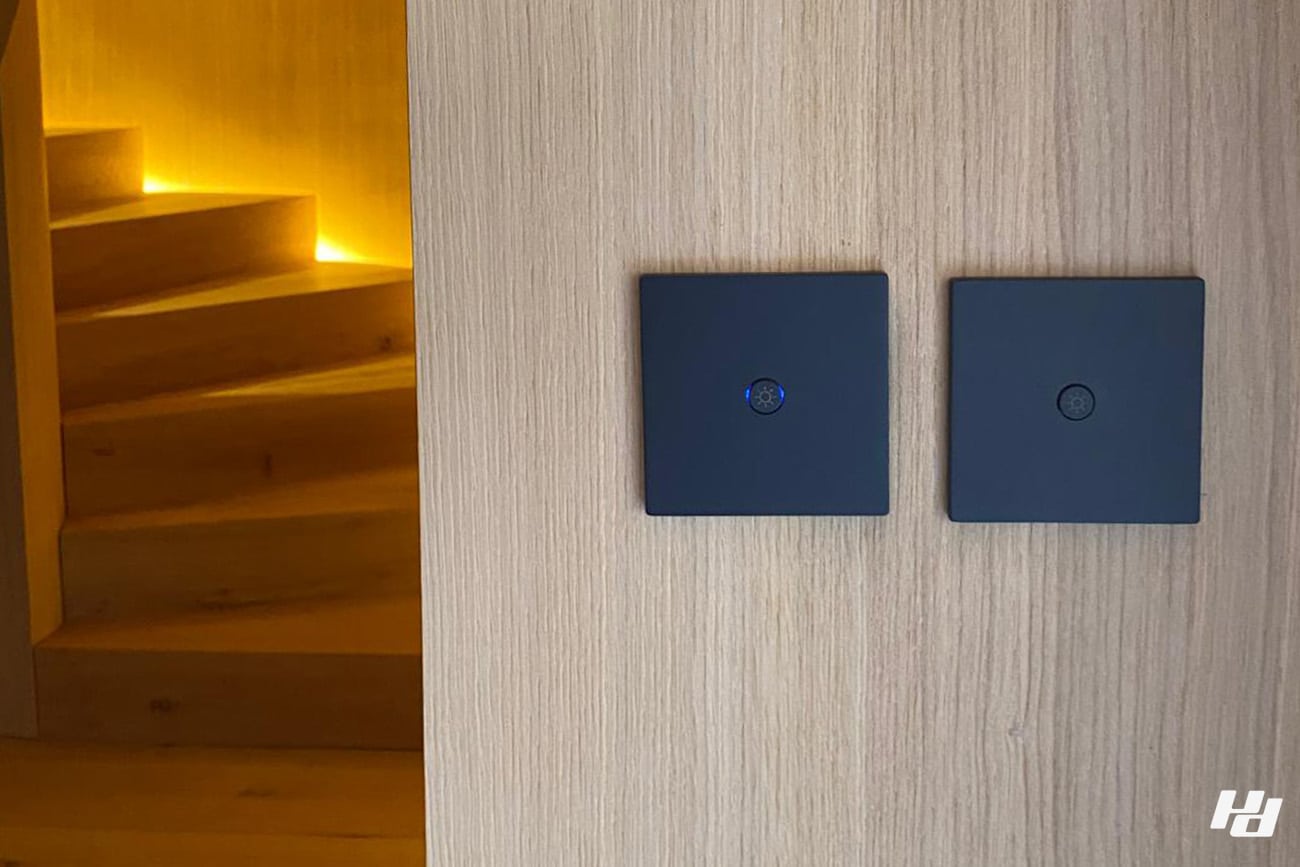 Per rendere i comandi semplici e intuitivi, il cliente ha deciso di installare in ogni stanza due pannelli di controllo, ognuno dotato di un pulsante singolo programmato per l’accensione dei punti luce al 100% oppure al 50% della potenza.