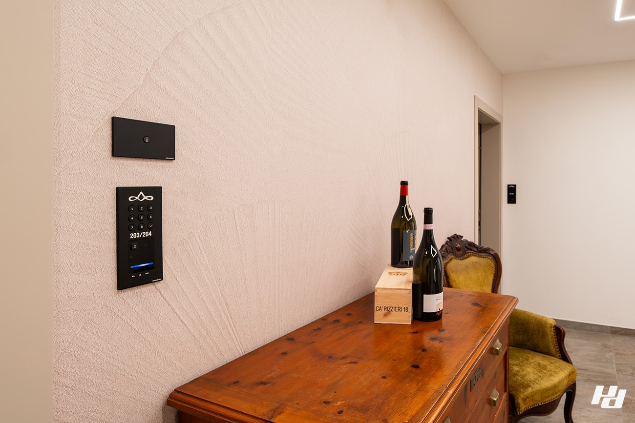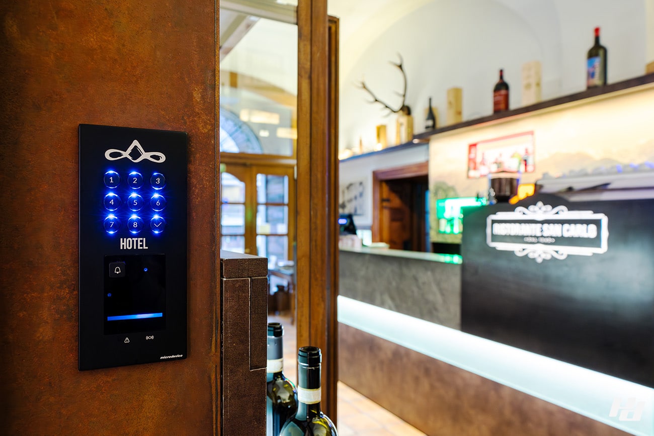Per assicurare al cliente una gestione performante e sicura dell’hotel, Microdevice ha realizzato appostitamente per Wine Hotel San Carlo un pannello di accesso doppio, che integra un lettore badge con un tastierino numerico. In questo modo, se l’ospite smarrisce il badge, la proprietà può abilitare l’accesso alla camera e ad ambienti selezionati generando in tempo reale un codice di sblocco temporaneo, che la stessa proprietà può facilmente disattivare al bisogno.
